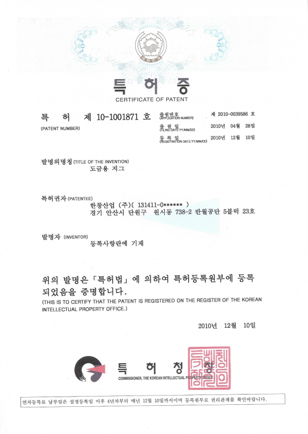 특허증(도금용 지그) 페이지 정보 작성자 관리자 댓글 0건 조회 1,053회 작성일 20-08-21 12:25 본문 . 첨부파일 특허증도금용지그.pdf (154.3K) 47회 다운로드 | DATE : 2023-12-22 11:58:53 목록 이전글ISO14001 환경경영시스템 인증(한글,영문) 20.08.21 다음글지그 디자인등록증(경완철) 20.08.21